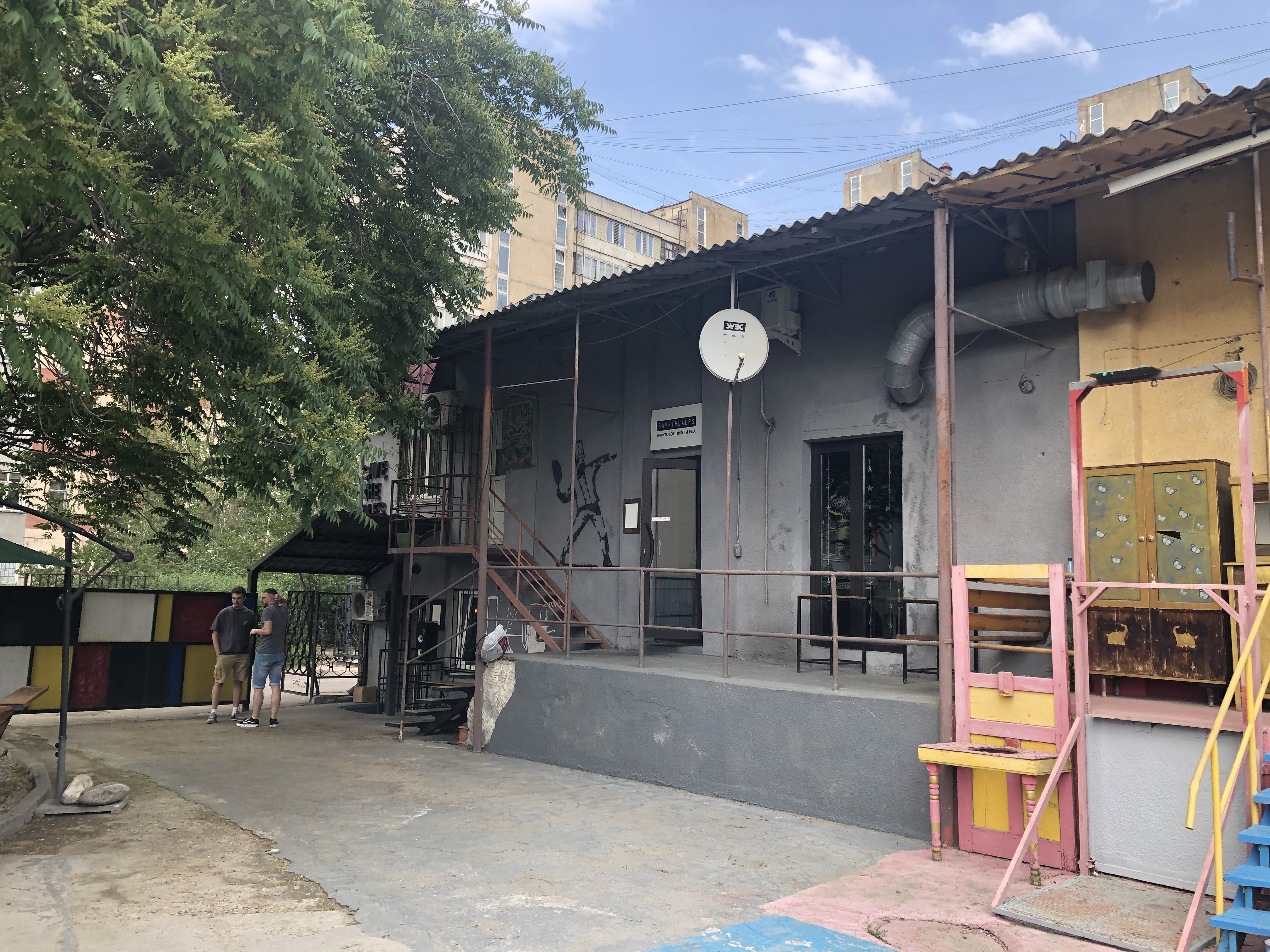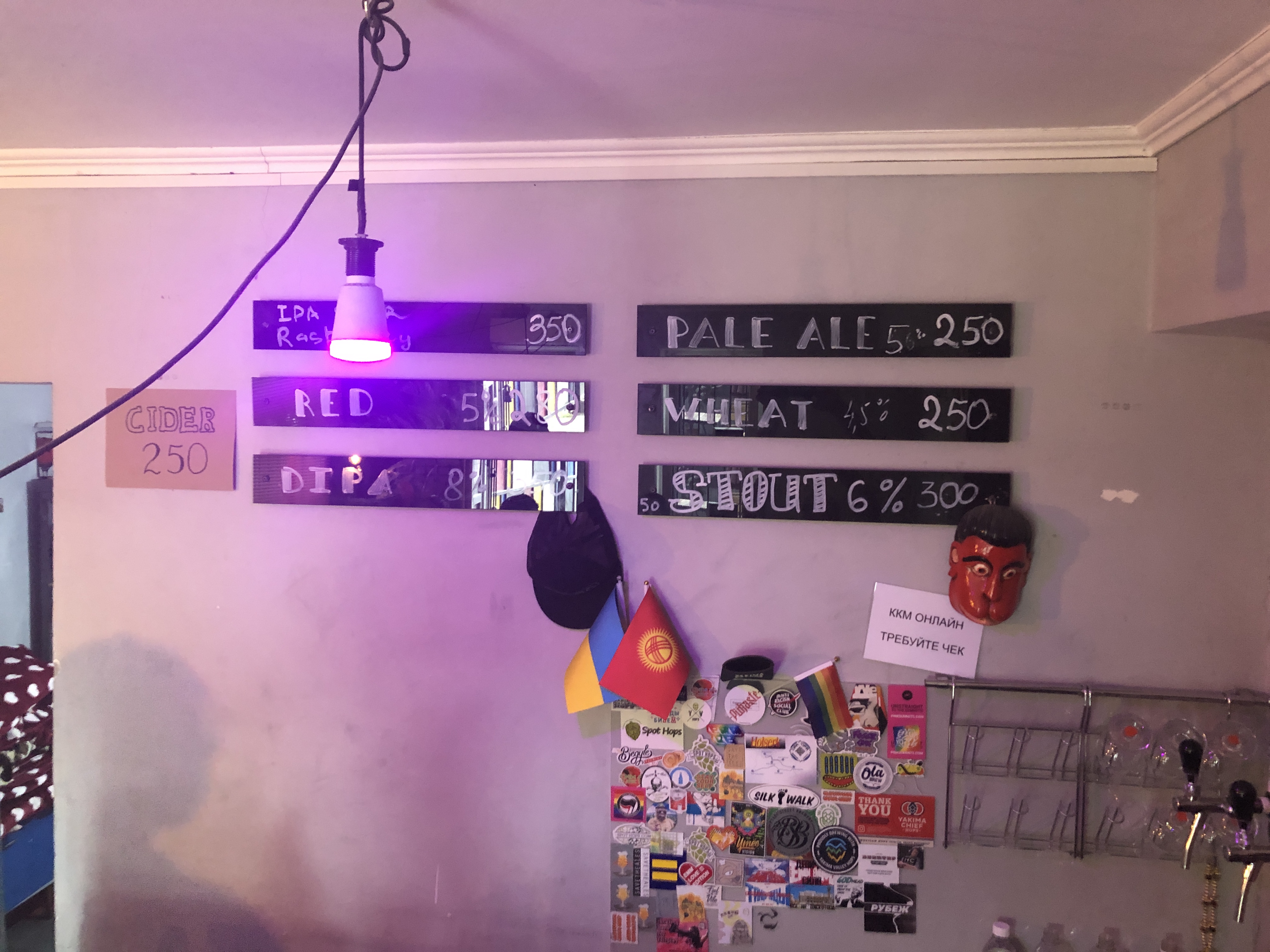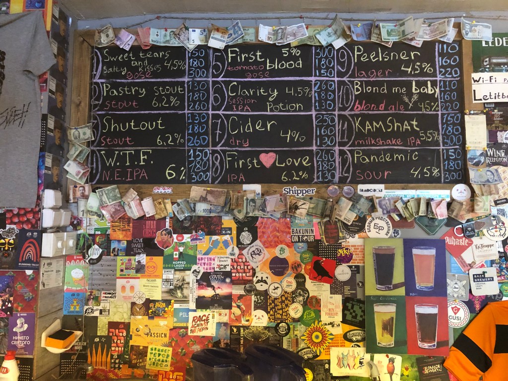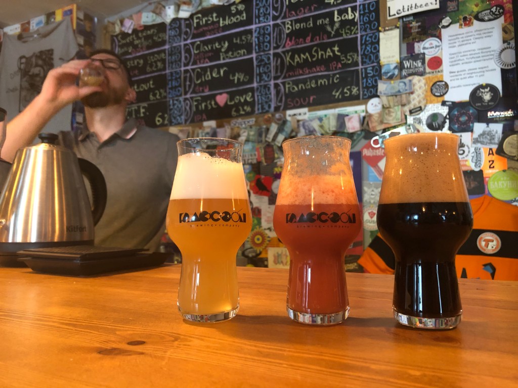 The three guys behind Raccon brewing is Konstantin Zinehenko, the brewers Sergey Kishenin and Shyngys Kunanbayev. Shyngys is living in nearby Almaty in Kazakhstan. Read about the Kazakh beer scene here. He is distributing their beer in Almaty and also running beer tours but does also visit Bishkek frequently to brew. Raccoon has brewed over 80 beers since their start in 2018. The small 500 liter brewhouse gives them the possibility to experiment more which is their passion. They are playful with their brews and give all beer English names so its easy to find them online. Tomato and watermelon sours, meads, pastry stouts and milkshake ipas are styles they do and not so much lager and easy ipas. They are the most experimental of the three and promised to bring out many more beer that will surprise and amuse. Their housebar Brewster is situated in an Soviet styled house but when inside it’s full of colors and expression, reflecting the rich palate of their beer flavours.
