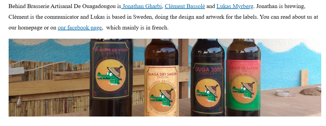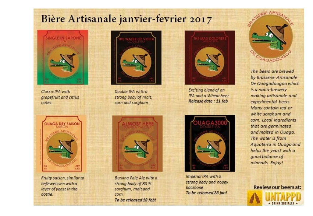 The beers had all local names such as Water of Volta IPA, Zone Du Bois Ale, Ouaga Dry Saison etc. The beers were sold at restaurant L Annexe that was run by two French chefs. After 2017 we move to Morocco and the brewery was closed. It was a small Nano brewery. Some of the beers are still listed on Untappd.