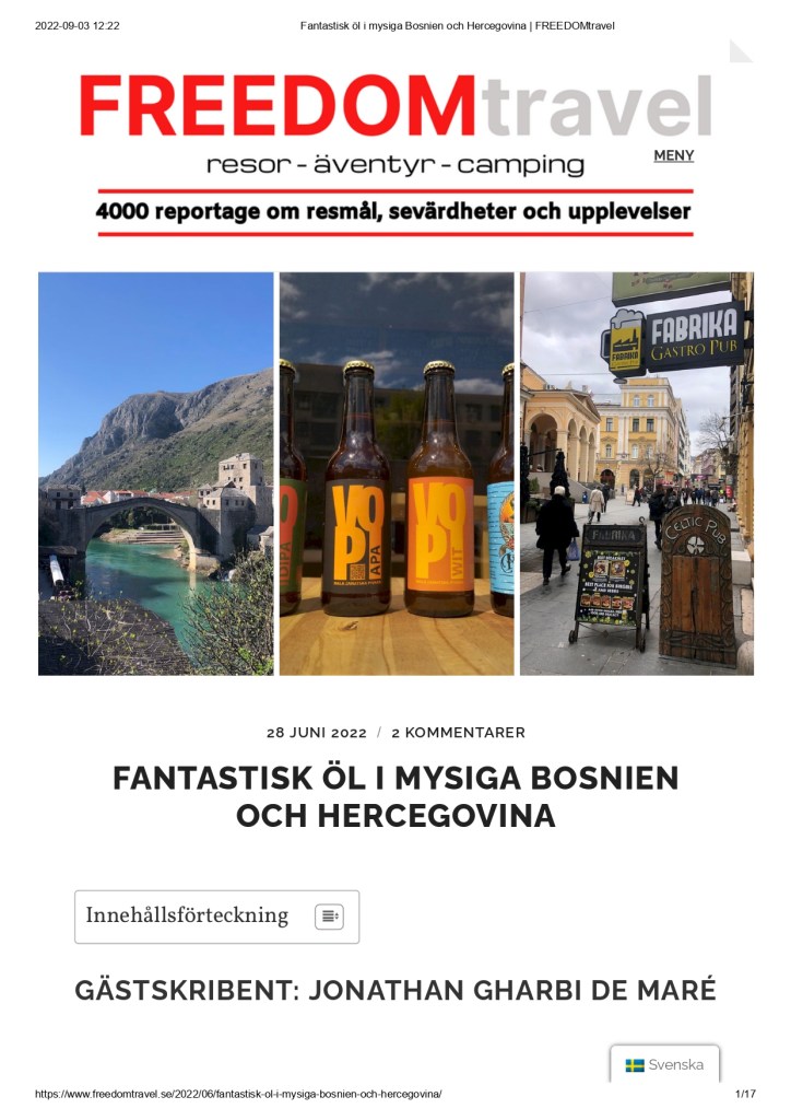Read the beer guide to Bosnia in Swedish, 28 June 2022, by Jonathan Gharbi de Maré. Online travel magazine. https://www.freedomtravel.se/2022/06/fantastisk-ol-i-mysiga-bosnien-och-hercegovina/.