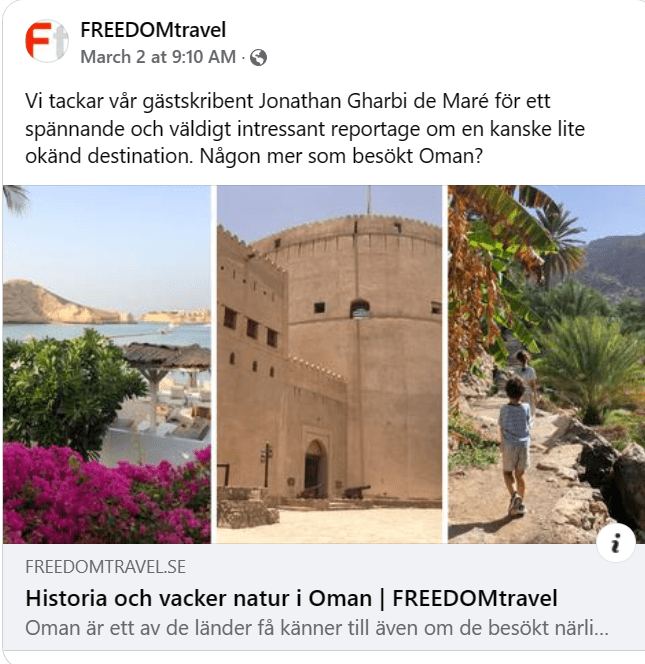 Article about travelling in Oman, 2 March 2023, Freedomtravel, online travel blog, in Swedish. https://www.freedomtravel.se/2023/03/historia-och-vacker-natur-i-oman/