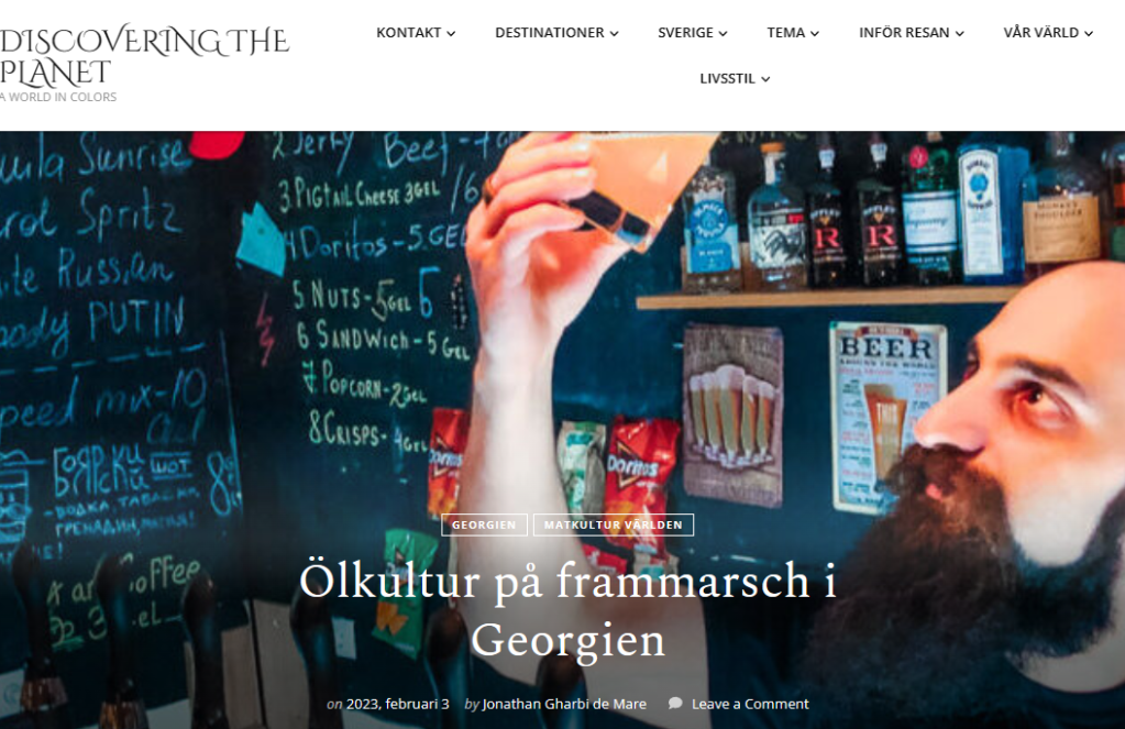 Article on craft beer in Georgia, 3 February 2023, for Discoveringtheplanet online travel blog, in Swedish. https://www.discoveringtheplanet.com/olkultur-pa-frammarsch-i-georgien/