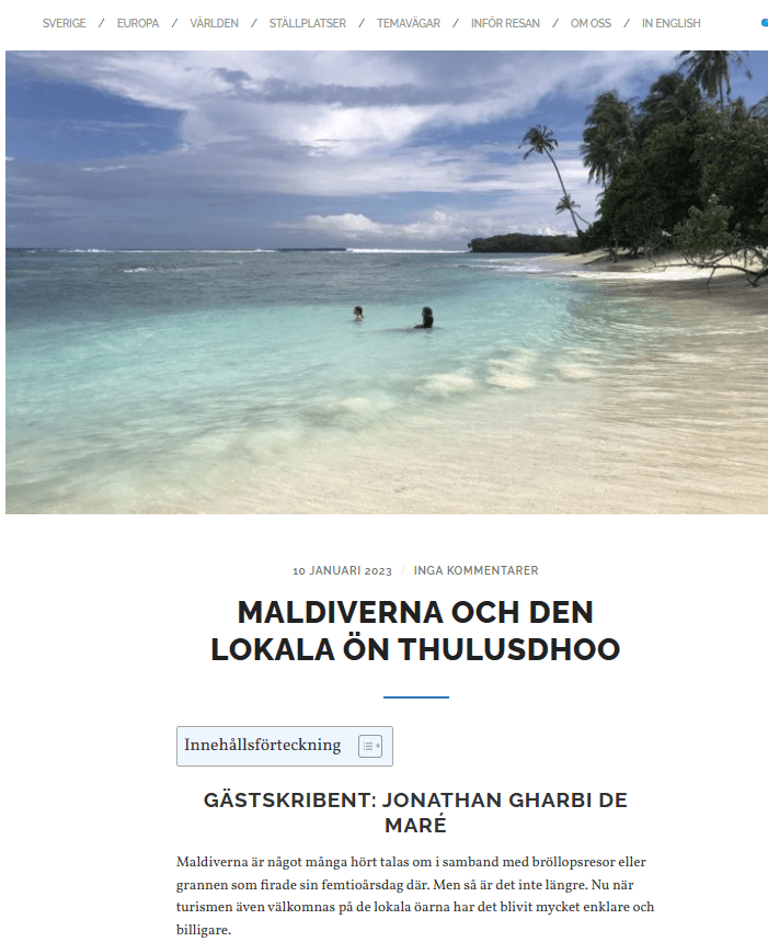 Article about travelling to Maldives and Thulusdhoo, 10 January 2023, Freedomtravel, online travel blog, in Swedish. https://www.freedomtravel.se/2023/01/maldiverna-och-den-lokala-on-thulusdhoo/