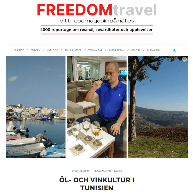 Article about travelling in Tunisia, 13 April 2023, Freedomtravel, online travel blog, in Swedish. https://www.freedomtravel.se/2023/04/ol-och-vinkultur-i-tunisien/ .
