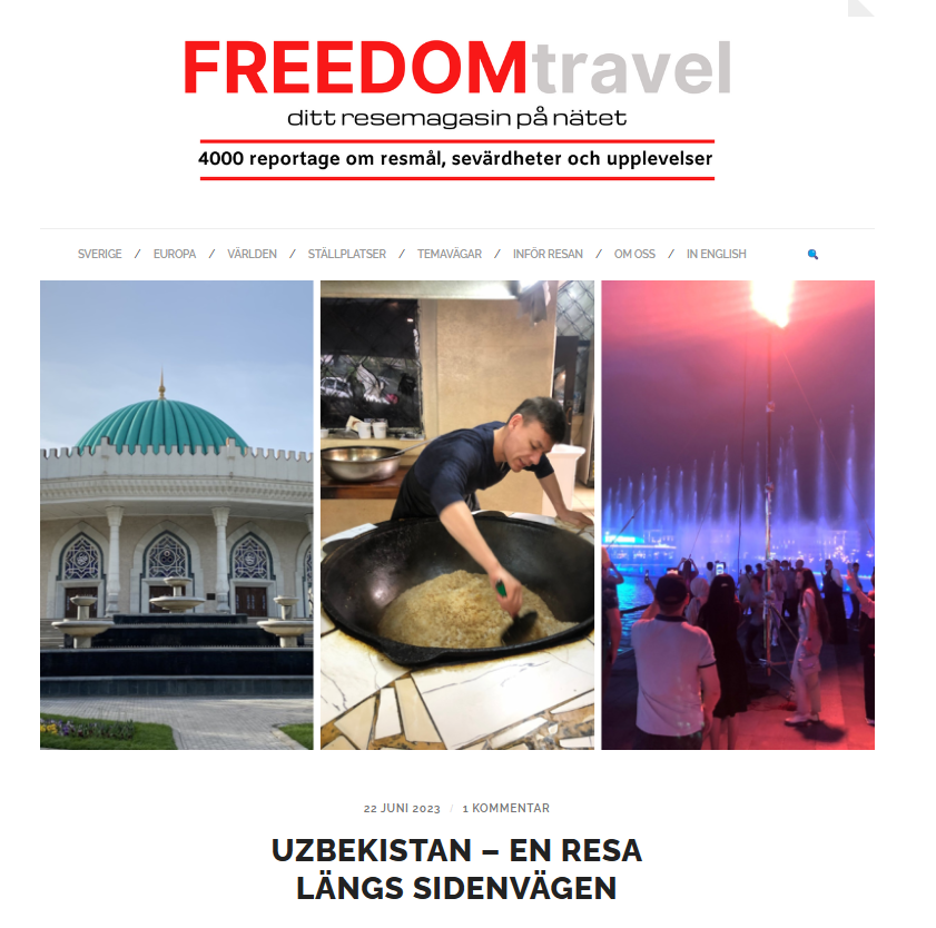 Article about travelling in Uzbekistan, 22 June 2023, Freedomtravel, online travel blog, in Swedish. https://www.freedomtravel.se/2023/06/uzbekistan-sidenvagen/