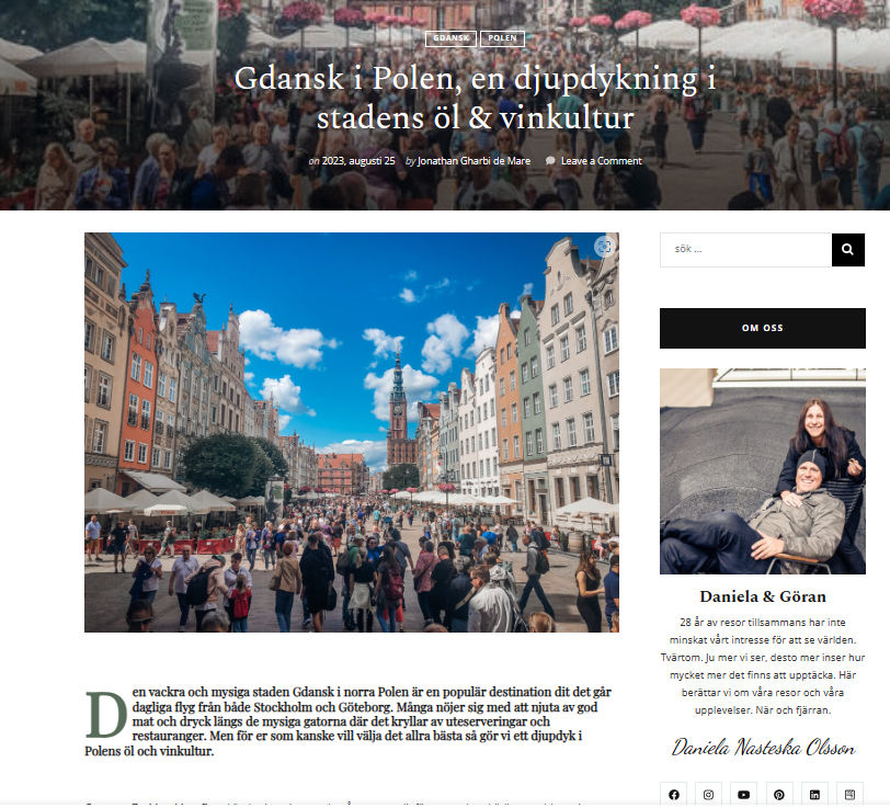 Article on craft beer & wine in Gdansk, 23 February 2023, for Discoveringtheplanet online travel blog, in Swedish. https://www.discoveringtheplanet.com/gdansk-i-polen-en-djupdykning-i-stadens-ol-vinkultur/
